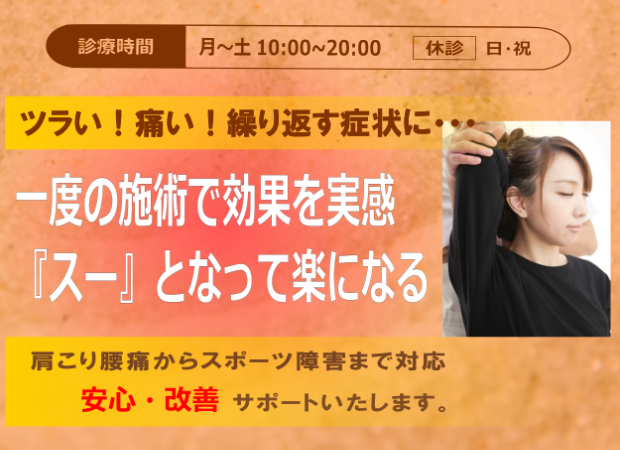 あまりの痛さに苦しくて辛かったですが、先生がとても丁寧に施術してくださり、とても楽になりました。